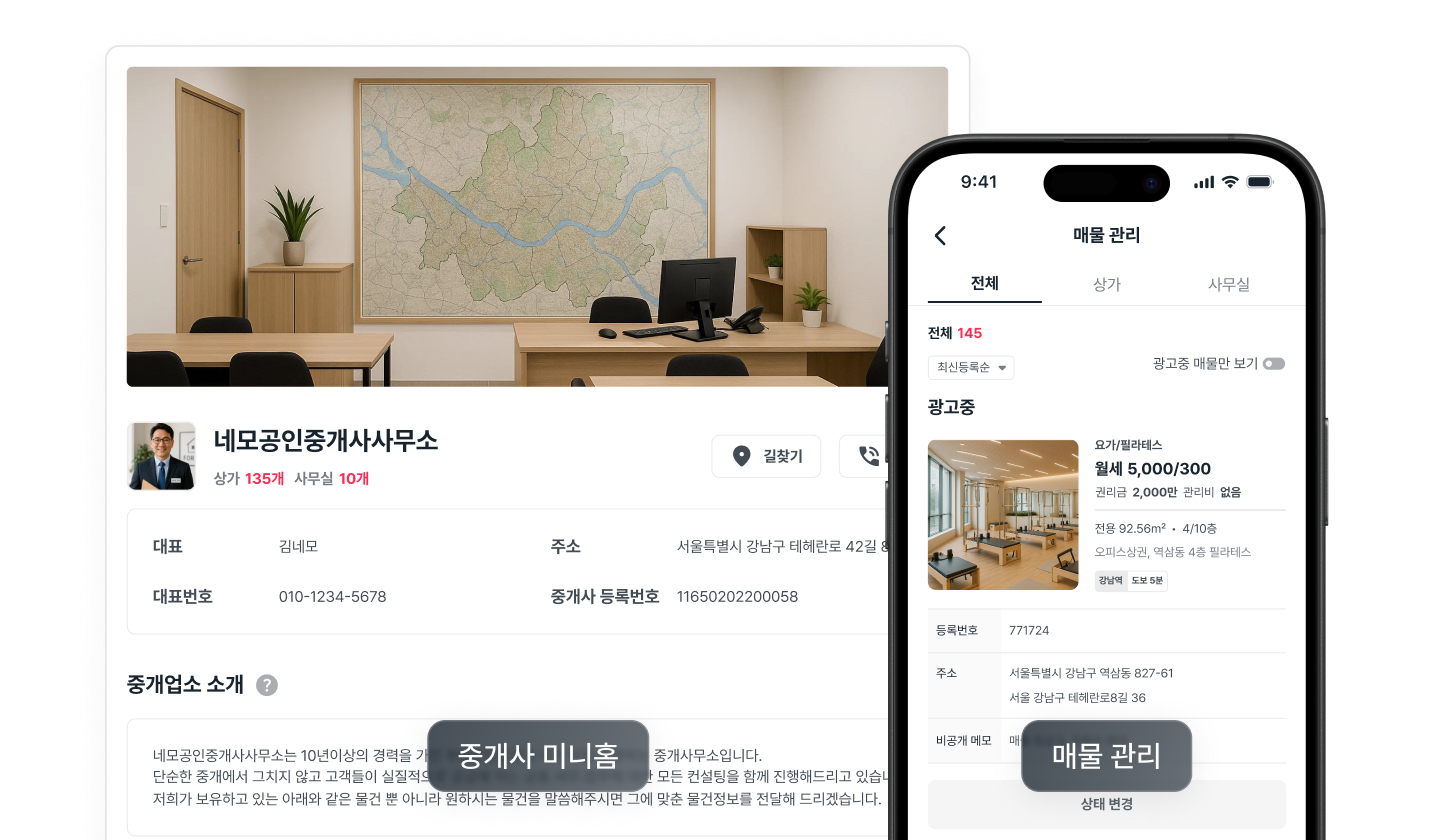 전용 페이지 통해 고객 문의, 매물 등록, 광고 성과를 한눈에 확인하고 효율적으로 관리할 수 있습니다.